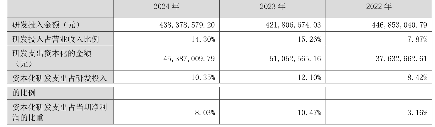2024年全年,公司研发投入金额为4.38亿元,同比增长3.93%;研发投入占营业收入比例为14.3%,相比上年同期下降0.96个百分点。此外,公司全年研发投入资本化率为10.35%。