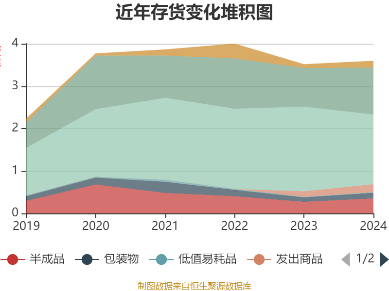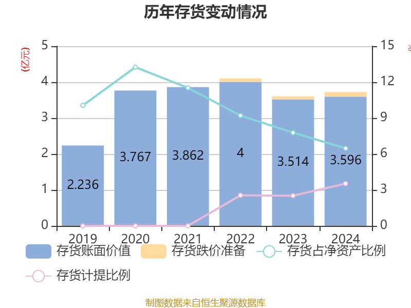 从存货变动来看,截至2024年末,公司存货账面价值为3.6亿元,占净资产的6.47%,较上年末增加815.47万元。其中,存货跌价准备为1315.52万元,计提比例为3.53%。